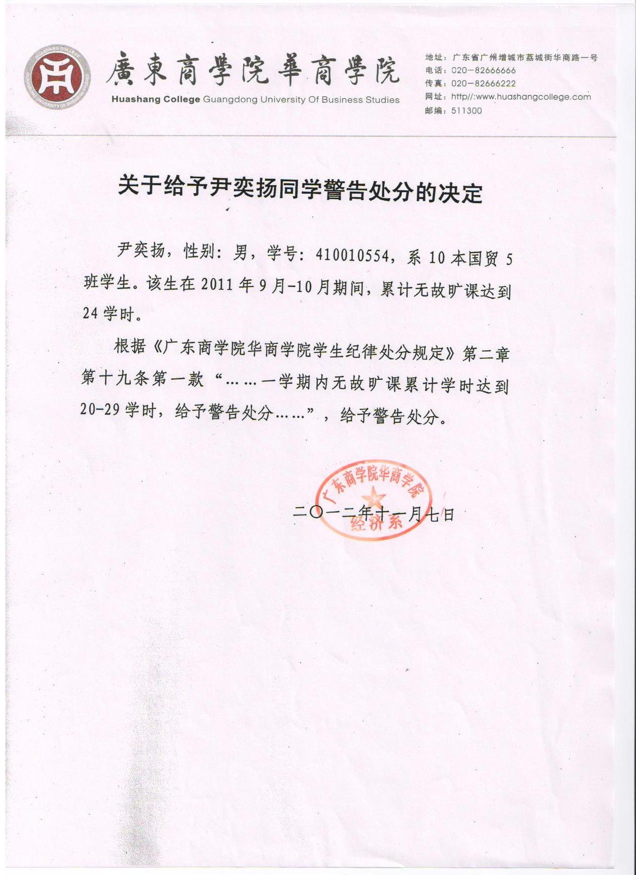 2012-2013学年上学期10月给予黄文杰等五位同学处分公告