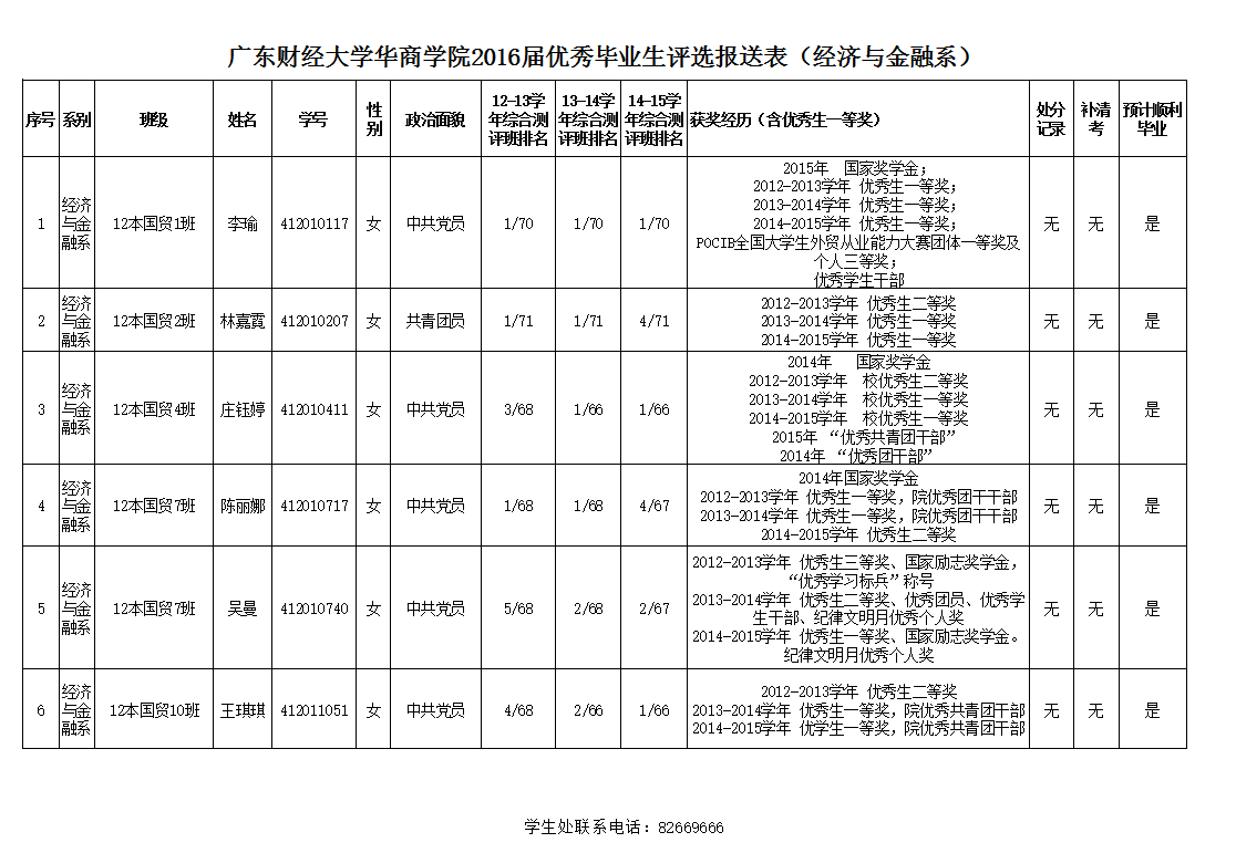 为表彰在德、智、体等方面全面发展和表现突出的毕业生,激励广大学生刻苦学习、奋发向上,学院决定在2016届全日制普通本科毕业生中评选优秀毕业生。根据学院通知精神,按照《优秀毕业生评选奖励办法》文件规定,由学生申请,系部评审,评选出经济与金融系2016届本科优秀毕业生6名,名单公示如下: