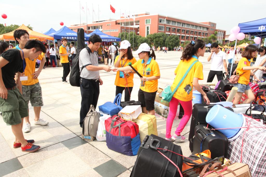 十时许,华商迎新到达高峰期。大本营、图书馆里、宿舍楼下如火如荼,老师、工作人员、志愿者应接不暇。注册、托运行李、找宿舍,都在工作人员和师兄师姐们的一条龙服务下井然有序开展。
