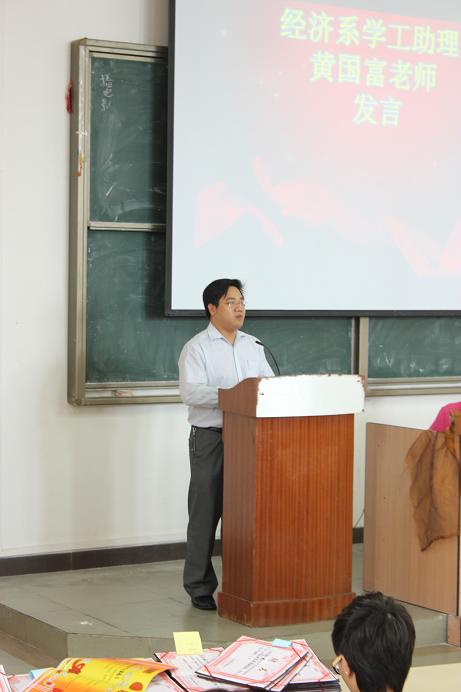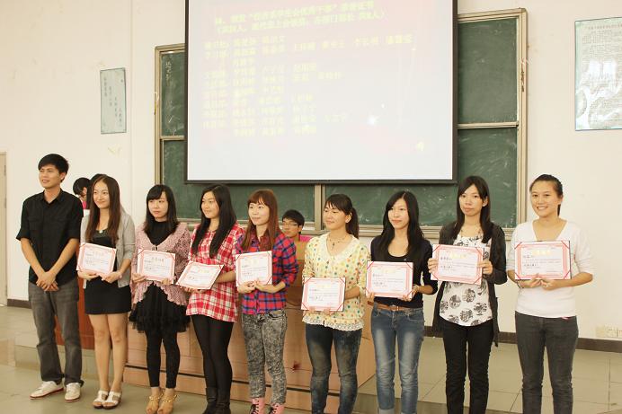 2011年11月8日14时30分,经济系于励志楼A208教室召开2010-2011学年表彰大会。经济系主任曾令华教授,学工助理黄国富老师,团总支书记杨思佳老师,学生会指导老师郭锦荣老师,11级辅导员黄秋铭、黄素贞、廖小安老师出席本次大会。
