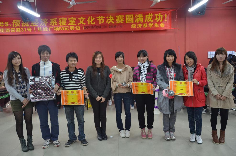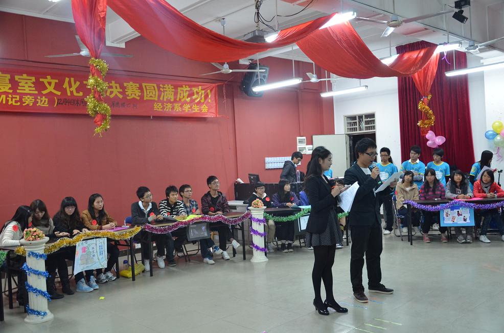 2011年12月4日晚上7点30分,由经济系学生会生活部举办的寝室文化节决赛在厚德楼c101如期举行,此次活动邀请了经济系学生会指导老师郭锦荣老师,经济系11级辅导员黄素贞老师,经济系团总支副书记杜振鹏、赖东园,以及经济系学生会主席张佳欣等多位嘉宾到场观看并担任评委。