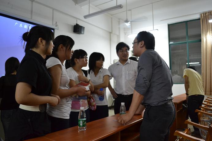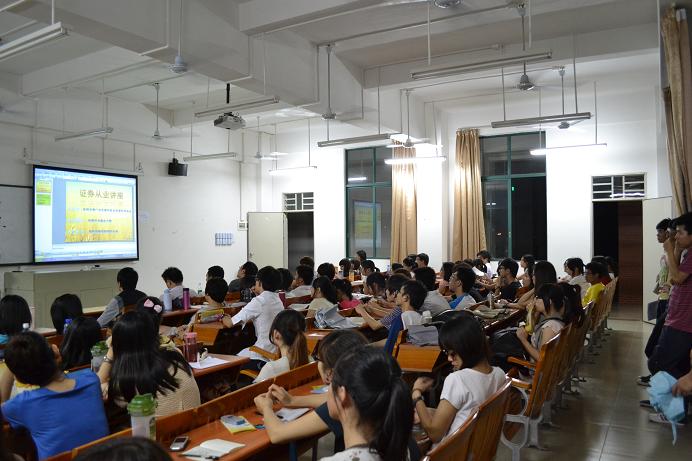 当讲座还没开始前,现场就早已坐满了前来听课的听众,课室已经里里外外都是人,可见同学们对证券行业的热情度极高。主持人宣布讲座开始后,曾汉平先生首先为本次讲座做了一个铺垫,为我们介绍了为什么证券行业属于一个掘金行业。其次,本次讲座的主要内容分为三大部分,第一是对证券行业做了一个大概的简介以及行业入门技巧,这个方面,主讲嘉宾主要是做了一下华西证券有限公司的结构图的介绍并介绍了从职员正道客户经理的历程;第二是针对社会的就业趋势,分析了证券行业的就业前景,他称,证券行业的从业人员属于金领级别,并且证券属于一个掘金领域,另外,证券在金融领域中是一个相对更好的选择;第三则是跟同学们讲解了证券从业资格证的考试技巧和应试方法,跟在场同学大概了划分了课本的考试重点并鼓励对此行业有兴趣的同学们们要好好努力。
