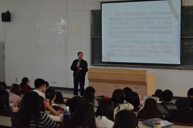 大会一开始,王丽忠教授主要介绍了毕业论文写作的目的和意义,并且重向我们讲述了本科生论文基本写作要求,对于论文撰写中需要注意的问题及常见错误也做了详细的指导。写毕业论文,对于每个毕业生来说,都是必须要经历的过程。毕业论文也是我们毕业的见证,对此,我们系今年也对我们的毕业论文提出了很多新的要求,希望毕业生们能够真正把所学知识与具体形势相结合,稳扎稳打,提高论文质量,充分展现四年所学,给学校领导老师交上一份满意的答卷,也为自己的大学生活画上一个精彩的句点。