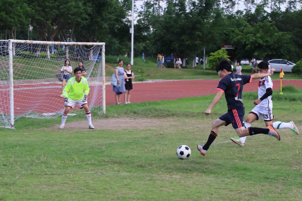 上半场,我系球队将公管系队抑制在对方半场。经济与金融系队一个过顶传球将球带过半场,队员间默契配合,趁着对方门将判断失误,将球顶进龙门;随着赛事的进行,公管系队也抓住我系球队犯规的契机,凭借一颗点球扳回一分,最终以2:2进入下半场。