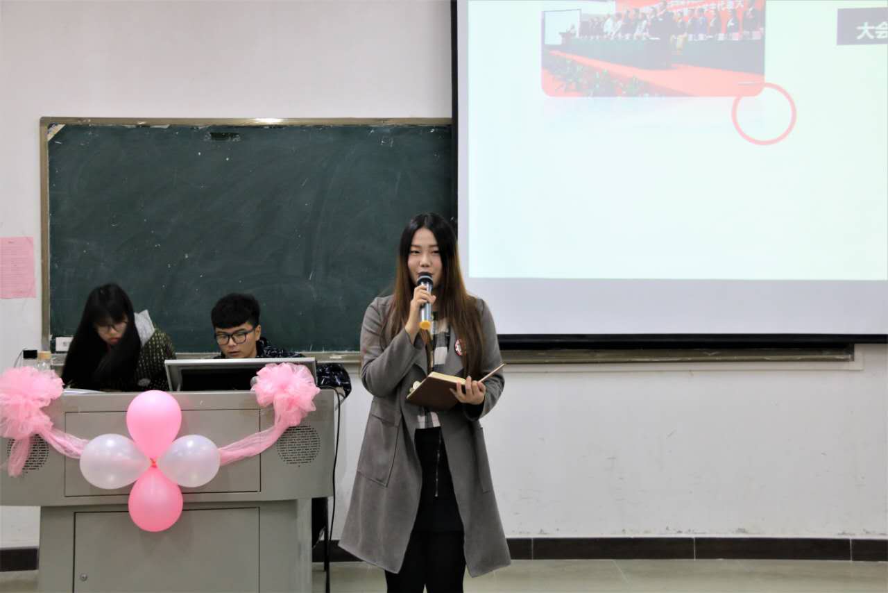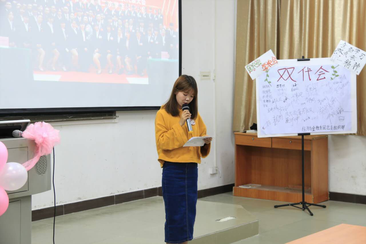 游戏时间总是飞逝,紧接着我系团总支副书记张慧卿作为团员代表发言,她说作为经济系的团员代表参与了本次“双代会”,她感到十分的荣幸。“双代会”为期两天,这期间经历了一些流程,让她深有感触,感到自己身上的责任与使命的重大,并号召大家通过“经济与金融系团总支学生分会”公众号的推文、“王牌销量”宣传海报等各种方式学习传达“双代会”精神。