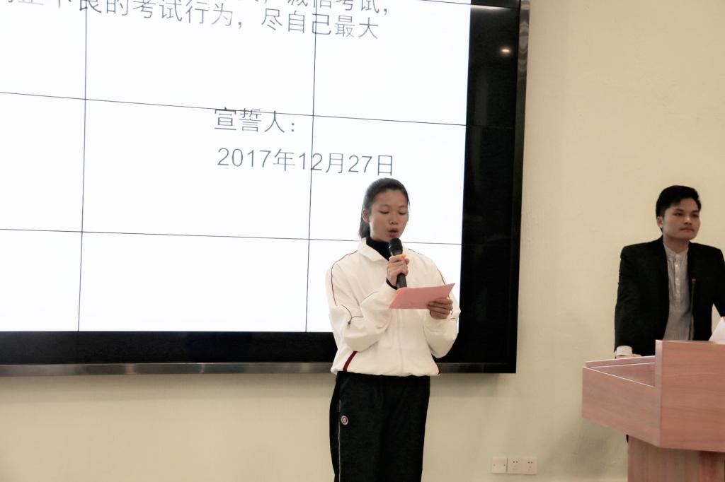 宣誓是一种形式,更是一种力量。全体学生干部在17级国贸7班周嘉瑜的带领下,进行了庄严隆重的期末考试宣誓,不违纪,不作弊是我们的原则,诚信考试,做学生干部的榜样是我们努力的方向,作为学生干部,必将肩负起责任,将诚信进行到底。