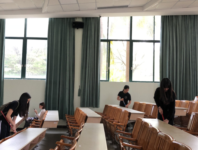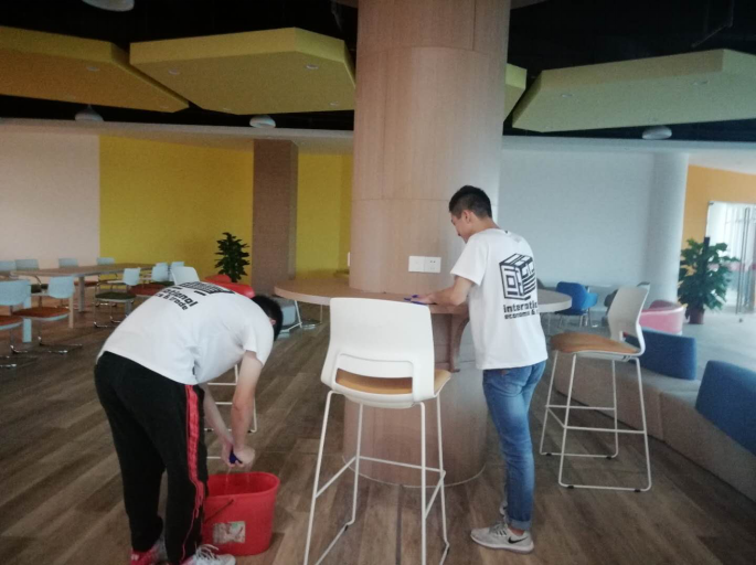 17本国贸1班志愿公益同学在图书馆清洗桌椅