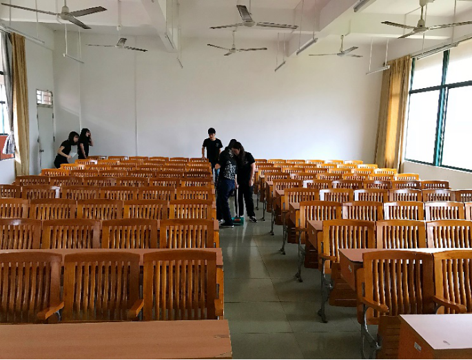 在各班班委的组织下,各班级的党员、入党积极分子、助学金获得者、团员等对校园道路、教学楼、图书馆、运动操场、学生公寓等区域进行志愿公益性的清洁行动,主要清扫垃圾、清理小广告、擦黑板、擦洗桌椅等。
