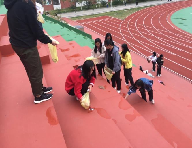 17本国贸7班志愿公益同学在运动操场收拾垃圾