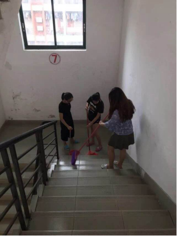 17本经济统计学班志愿公益同学在清扫学生公寓楼梯
