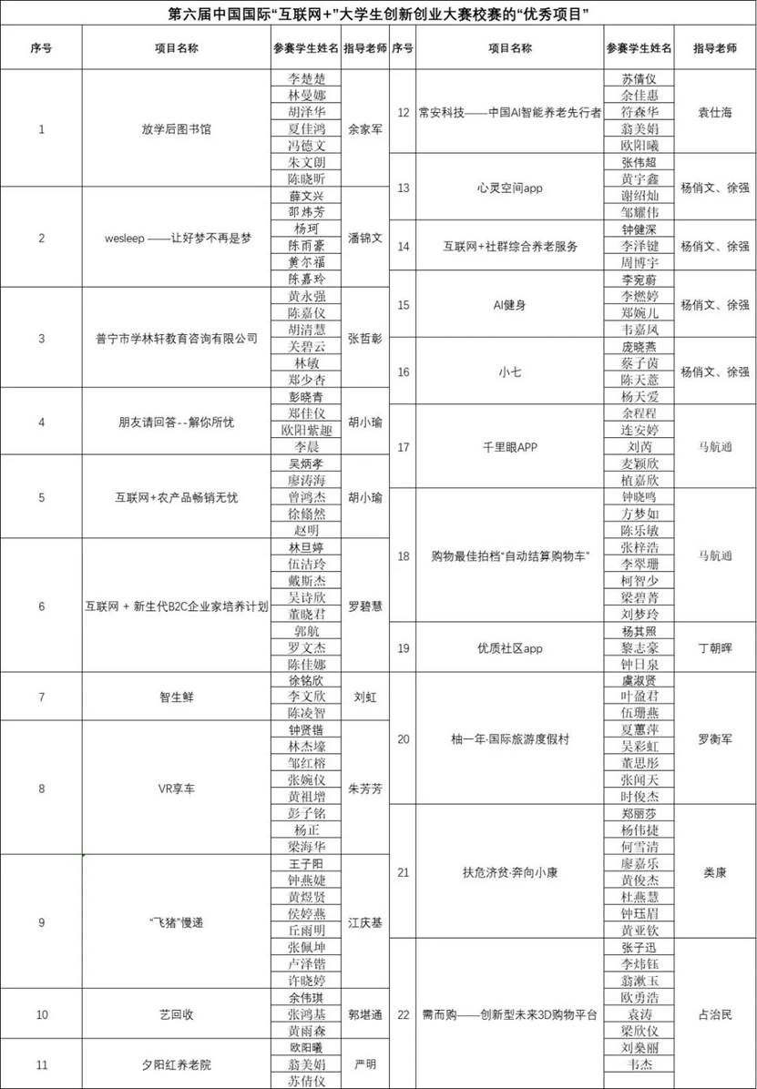 在第六届中国国际“互联网+”大学生创新创业大赛校级决赛中,我系参赛队伍中“放学后图书馆”、“普宁市学林轩教育咨询有限公司”两个项目获得“铜奖”,我系也获得了校级颁发的“优秀组织奖”。