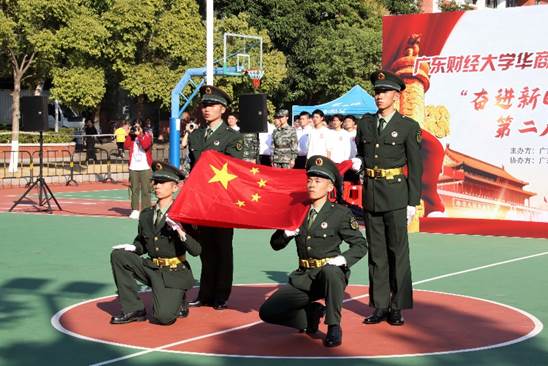 护旗手昂首挺胸,迈着整齐有力的步伐前进。音乐响起,全体庄严肃穆,退伍士兵们举手敬礼,在场的各位观众及嘉宾庄严地对国旗行注目礼。