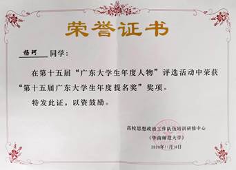 由广东省教育厅指导,高校思想政治工作队伍培训研修中心、教育部高校辅导员培训和研修基地主办的第十五届“广东大学生年度人物”的评选结果揭晓。其中我系杨珂同学获评“第十五届广东大学生年度人物提名奖”。