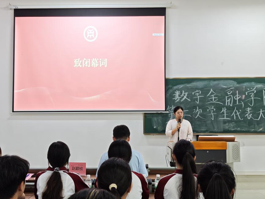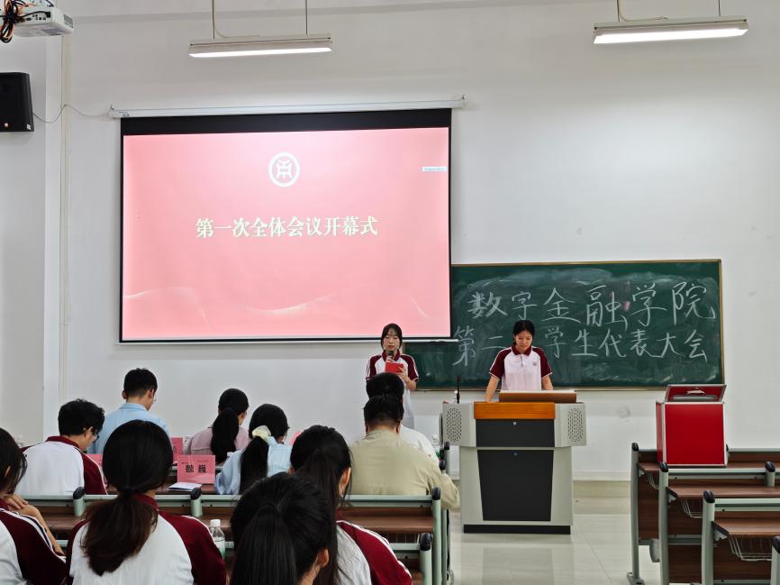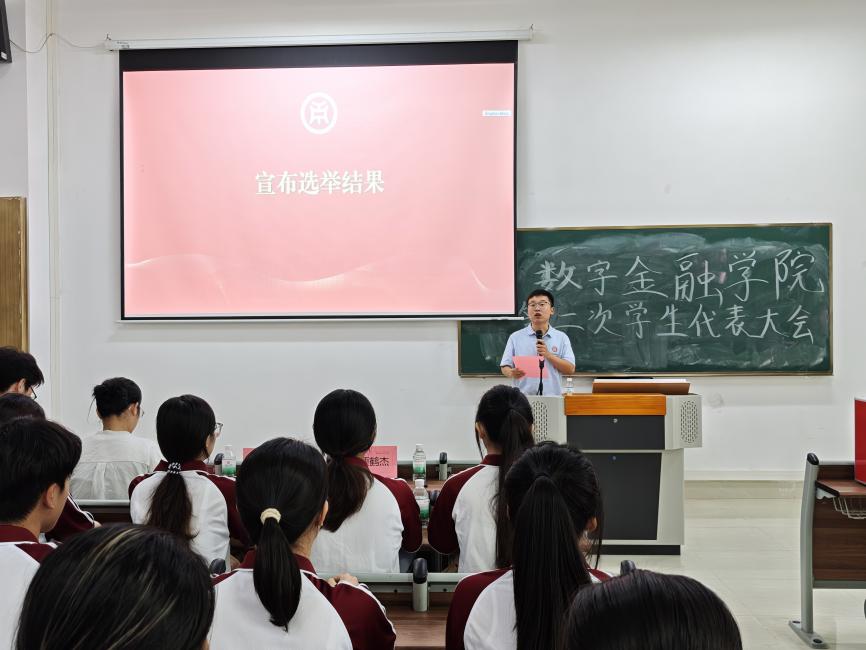 2025年11月11日下午,广州华商学院数字金融学院第二次学生代表大会在肇庆校区6号楼304教室顺利召开。本次大会以“总结过往启新程,凝心聚力向未来”为主题,全面回顾了过去一年的团学工作,选举产生了新一届学生委员会及主席团成员,并为下一阶段的工作指明了方向。 校团委何以立老师、数字金融学院团委副书记赵颖祯老师、数字金融学院学生会指导老师栗鹤杰,及各二级学院团学指导老师、校学生会代表等嘉宾出席会议。全体正式代表、监票人、计票人及工作人员参加大会。 会议议程回顾 大会在庄严的国歌声中拉开帷幕。 数字金融学院团委副书记赵颖祯老师致开幕词。她向与会代表和嘉宾表示欢迎,并强调了学生代表大会在凝聚青年力量、推动学生会改革发展中的重要作用。 校团委何以立老师宣读批复文件,代表校学生会同意召开本次学代会,并对会议筹备、组织及选举工作提出明确要求。 会上,高朋杰同学代表第一届学生委员会作工作报告,系统总结了过去一年在思想引领、组织建设、校园文化、权益服务等方面的工作成果,分析了存在的问题,并提出了未来的工作方向。 在第二次全体会议上,与会代表表决通过了总监票人、监票人、计票人名单,并投票选举产生了新一届学生委员会及主席团成员。 选举结果公布 经投票选举,大会顺利产生了数字金融学院第二届学生委员会委员及第二届学生会主席团成员。 圆满闭幕 赵颖祯老师致闭幕词。她表示,本次大会圆满完成各项议程,总结了过去经验,规划了未来发展,并对新一届学生委员会提出殷切期望,希望他们务实担当、服务同学,推动学院团学工作再上新台阶。 大会在热烈的掌声中顺利闭幕。