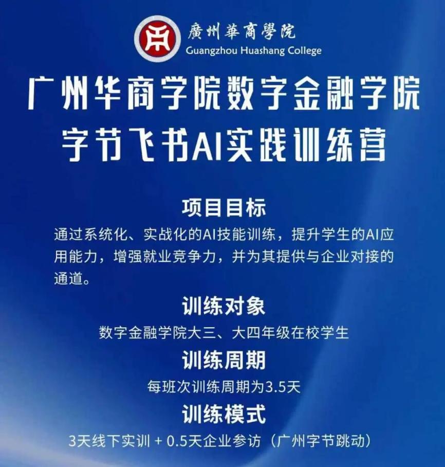 在人工智能技术重构千行百业的今天,金融与科技的深度融合已成为时代必然。为培养具有前瞻视野的复合型金融人才,我院联合字节跳动飞书团队,于近期成功举办首期"AI实践训练营"。35名来自大三年级的优秀学子,在广州华商校园与字节跳动之间,完成了一场从认知颠覆到实战淬炼的加速进化。 干货满满 能力进阶 训练营以"企业级实战"为核心理念,3天高强度线下实训+0.5天字节跳动总部深度参访,构建起"学—练—看—思"的完整闭环。课程内容不再是零散的软件操作,而是围绕真实工作场景设计的五大核心模块: 1.AI赋能投资分析:从海量财报数据中智能提取关键指标,到构建动态估值模型,同学们首次体验到"用自然语言对话完成复杂分析"的效率革命。一位参训同学感叹:"过去需要3小时做的行业研究,现在聚焦提问质量,20分钟就能拿到结构化成果。" 2.提示词工程与飞书平台入门:掌握AI时代的"编程语言"—— prompt engineering。通过飞书多维表格与AI的深度融合,学生们学会了如何设计高价值的提示词,将抽象需求转化为精准输出,为后续开发奠定思维基础。 3.提示词工程与飞书平台入门:从自动生成金融研究报告初稿,到智能搭建项目管理看板,同学们在真实业务流中感受"一人千军"的效率倍增。小组协作中,飞书文档的实时协同与AI助手成为团队"隐形智囊"。 4.智能体(Agent)开发与实战这是最具挑战也最具成就感的环节。在导师带领下,学生们从零搭建金融资讯抓取Agent、投资风险预警Bot,看着自己创建的"数字员工"成功跑通任务时,教室里的欢呼声盖过了空调轰鸣。 追逐梦想 未来成长 训练营的最重磅环节,无疑是对字节跳动广州总部的深度参访。这不仅是简单的企业参观,更是一场从"学生思维"到"职场视角"的认知校准。 踏入字节跳动广州总部,工作人员热情地带领同学们参观,详细介绍着各个区域的功能。在这里同学们看到了AI技术如何深度融入日常办公,从智能会议系统的便捷使用,到基于AI算法的项目管理工具高效运作,每一个细节都展现出AI应用文化的强大魅力。了解到在实际工作中如何借助AI提升效率、解决难题,这种身临其境的体验让同学们对互联网大厂的AI应用文化有了更为直观和深刻的认识。 后续开展的讲座中,可以亲眼看到飞书产品经理如何用飞书多维表格+AI在10分钟内完成竞品数据抓取与分析。在职拥有金融背景的飞书产品经理现身说法,讲述了从传统券商到科技大厂的转型路径,让在座学生看到"金融+科技"的N种可能。 飞书教育团队负责人也真诚的分享了AI时代的人才观:“我们不缺会操作工具的手,缺的是能定义问题、设计流程、调教AI的脑子。” 带队老师钟坚毅院长还提出了"三个转变"的人才培养理念:从"知识记忆"向"问题定义"转变,从"工具操作"向"系统设计"转变,从"单兵作战"向"人机协同"转变。他指出这次训练营最大的价值,不是让学生多掌握几个软件,而是提前让他们在真实产业场景中,希望同学们可以完成从"学生"到"准职场人"的身份预演。 认知破壁 思维升级 训练营最宝贵的,不仅是技能本身,更是思维方式的刷新。 1.提问力>记忆力:当AI能瞬间调取知识,提出好问题的能力成为核心竞争力。以前会担心AI替代自己,其实AI是放大镜——放大的正是你思考的深度。 2.人机协同>单兵作战在:智能体开发环节可以深刻体会到:未来的职场赢家,一定是能高效"指挥"AI军团的人。金融专业不再是Excel与计算器,而是"业务理解+数据思维+AI工具链"的三位一体。 3.实战场>模拟题:真实的企业级工具、真实的数据场景、真实的字节导师点评,这种"去滤镜化"的训练让同学们提前触摸到行业脉搏。这比任何一门理论课都更接近产业前沿。 结 语 3.5天很短,短到刚触摸AI的门把手就要说再见;3.5天又很长,足够在年轻人心中种下一颗"用技术重新定义金融"的种子。结营不是终点,学院将持续搭建校企协同育人平台,让"训练营"模式成为人才培养的常态化引擎。 据悉,优秀学员将被纳入"数字金融AI先锋计划",优先获得企业导师辅导、实习推荐及项目孵化资源。正如字节跳动飞书教育团队负责人在分享时所说:"我们不是在培养工具使用者,而是在培育AI时代的原住民。" 下一站,我们共同期待这些年轻的"AI原住民"在金融科技的赛道上,跑出属于华商人的加速度!