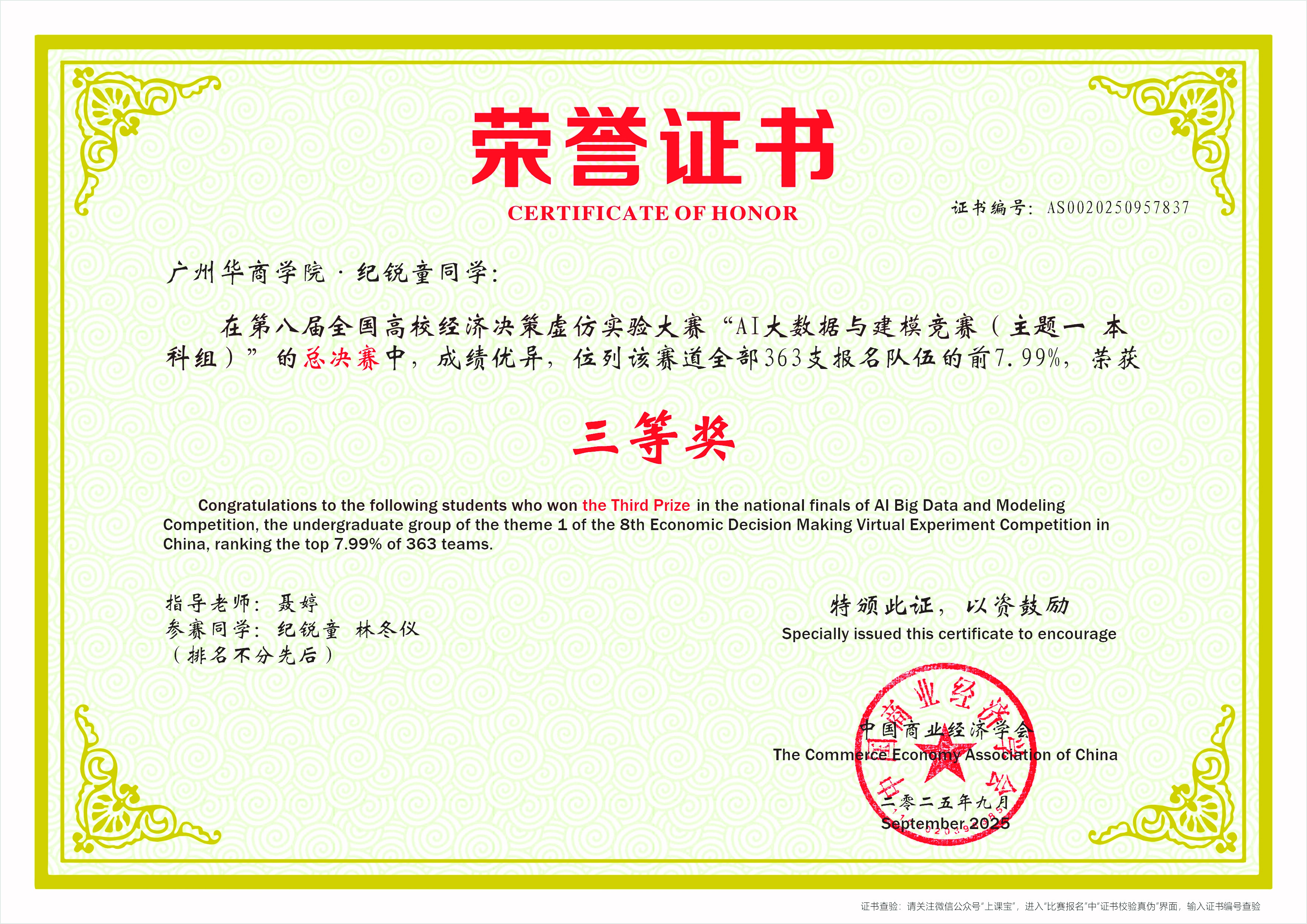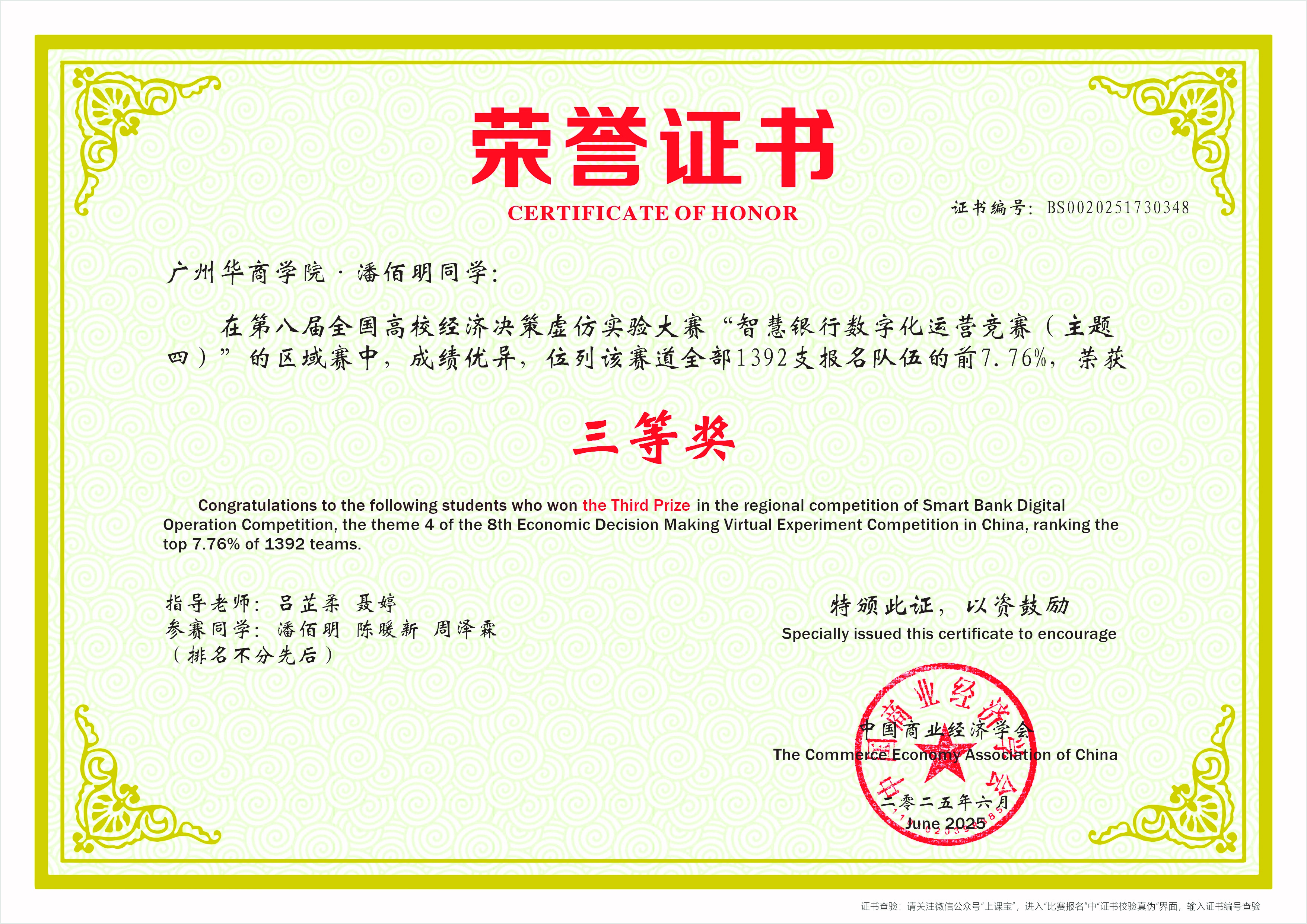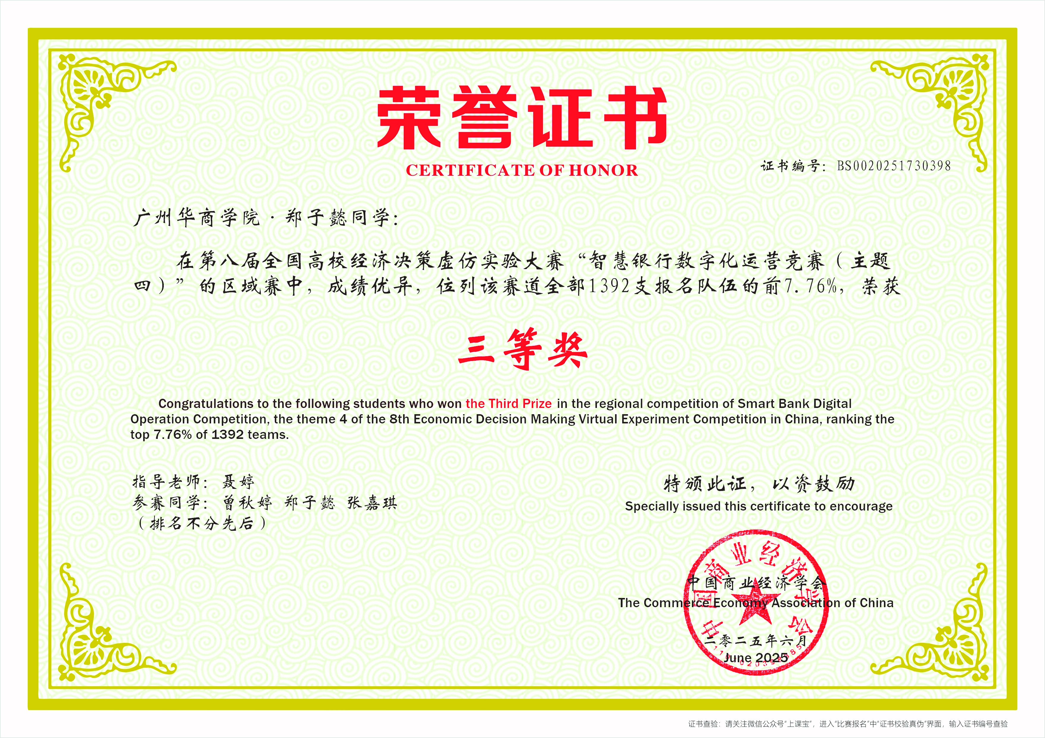 近日,第八届全国高校经济决策虚拟实验大赛各赛道赛事圆满落幕,智慧银行课程组组织学生出征赛道一(AI大数据与建模竞赛)、赛道四(智慧银行数字化运营竞赛),在聂婷、何煦、郭文瀚、左光宇、卢敏、吕芷柔六位指导老师的指导下,凭借实训课堂扎实的学习基础、创新的实践思路与高效的团队协作,在区域赛及总决赛中屡创佳绩,体现了应用型人才培养中的鲜明特色与突出成效。 本届大赛中,智慧银行课程组的备赛热情与参与规模再创新高:校赛初赛阶段报名队伍达63支,区域赛实际参赛队伍18支,创下历年参赛队伍数量与整体水平的双重峰值。从校赛选拔的激烈角逐到区域赛的同台竞技,再到总决赛的巅峰对决,六位指导老师全程跟进,从赛事规则解读、解题思路梳理、智能工具实操到团队协作优化,为参赛学生提供了全方位、精细化的指导支持,助力学生稳步突破自我、冲刺佳绩。 经过多轮严苛比拼,课程组最终在两大赛道收获亮眼战果: 赛道一(AI大数据与建模竞赛 总决赛):作为课程组今年新增参与的赛道,首次出征便实现突破,成功斩获全国总决赛三等奖,队伍在363支本科组队伍中排名前7.99%,彰显了学生在智能工具应用领域的潜力与实力。 赛道四(智慧银行数字化运营竞赛 区域赛):参赛队伍在全国1392支队伍中脱颖而出,斩获1项二等奖、7项三等奖,所有获奖队伍均跻身全国前7.76%,其中二等奖队伍位列前5.24%,展现了扎实的智慧银行运营管理专业能力; 本次新增的 AI 大数据与建模赛道,成为培养学生数字化素养的重要实践平台。在指导老师的针对性辅导下,学生系统运用 AI 建模、大数据分析工具解决实际经济决策问题,不仅深化了对专业知识的理解,更显著提升了问题分析、数据处理及智能工具落地应用的综合能力,为数字经济时代复合型人才的成长奠定了坚实基础。 本次赛事成绩的取得,是师生协同发力、深耕实践的成果,也验证了课程组 “以赛促学、以赛促练、以赛促教” 教学模式的有效性。未来,智慧银行课程组将继续以专业赛事为抓手,深化实践教学改革,充分发挥指导教师的专业优势,进一步提升学生的数字化实战能力与创新思维,为行业培养更多高素质应用型人才。