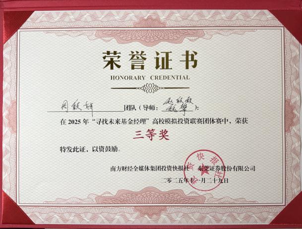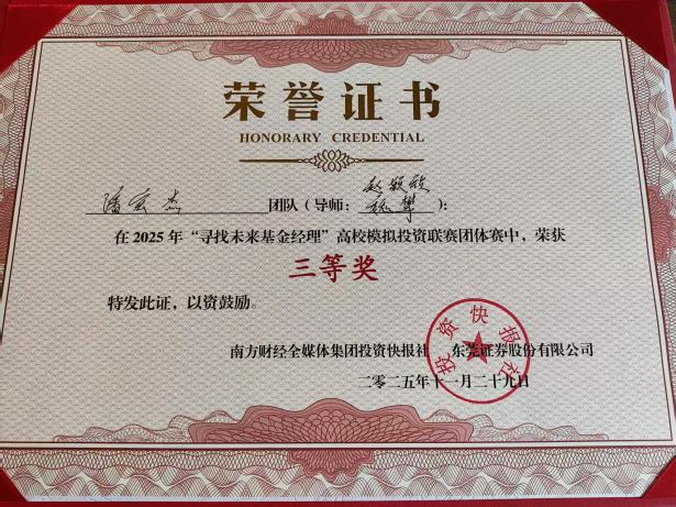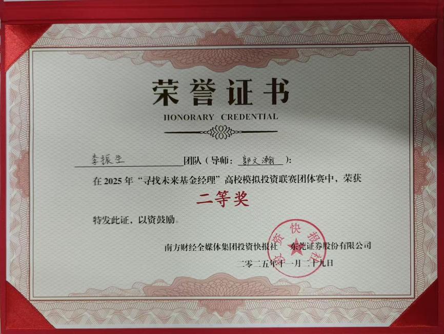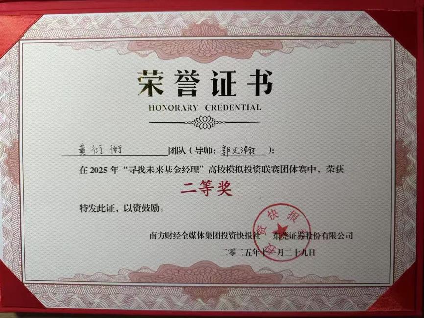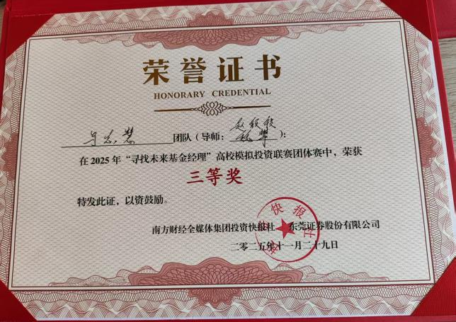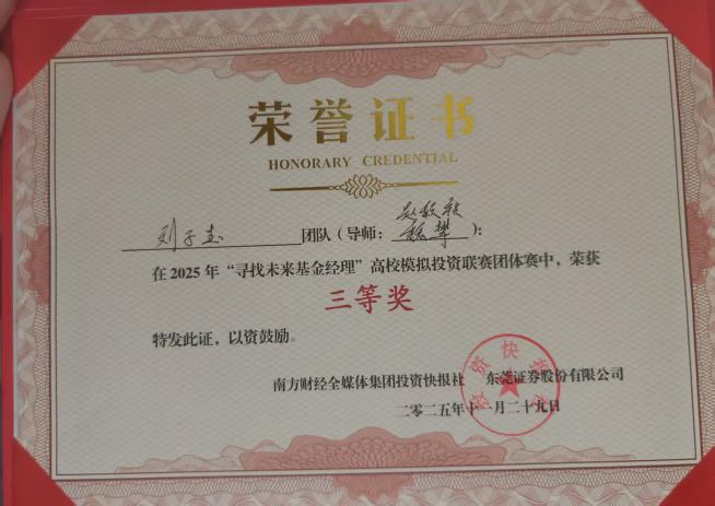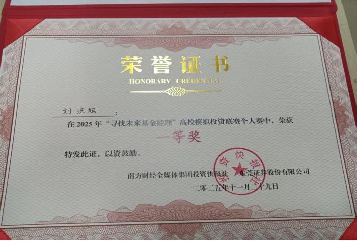 近日,2025年“寻找未来基金经理”高校模拟投资联赛总决赛圆满落幕。广州华商学院数字金融学院学子在此项大湾区高校金融实践教育的标杆赛事中表现卓越,一举夺得个人赛冠军、团队赛二等奖和团队赛三等奖的优异成绩,充分展现了我院在应用型金融人才培养方面的扎实功底与丰硕成果。 佳绩频传,华商学子闪耀金融赛场 本届赛事由南方财经全媒体集团、东莞证券联合主办,吸引了粤港澳大湾区近4000名高校学子参与。经过为期两个月的初赛、复赛激烈角逐,我院学子在模拟交易、投资策略报告和现场答辩等多个环节中脱颖而出。 尤为瞩目的是,来自我院24级金融科技优才班的刘洪旭同学,凭借其敏锐的市场洞察力和稳健的投资策略,以71.79%的超高收益率在近4000名参赛者中力拔头筹,荣膺个人赛冠军,展现了新生代金融人才的巨大潜力。 在团队赛中,由郭文瀚老师指导的“Haley”团队(成员:黄衍衔、张睿、谭凱尹、李振生) 凭借严谨的逻辑思辨、默契的团队协作和出色的现场答辩,荣获大赛二等奖,其综合素养获得评委一致好评。 由赵颖祯、魏攀老师共同指导的“感动不是心动”团队(成员:潘宏杰、刘子玉、周颖妍、马志慧)同样表现不俗,斩获团队赛三等奖。 精心组织,构建“赛教融合”育人生态 优异成绩的背后,是学院长期以来坚持“以赛促学、以赛促教、赛教融合、校企联动”人才培养模式的生动体现。 精准宣传与高效组织:赛事启动后,学院高度重视,迅速成立由院领导牵头、专业系部和辅导员协同的竞赛工作委员会,面向经管类相关专业进行精准动员和有序组织,确保了参赛工作的顺利推进。 深化产教融合:本次竞赛不仅是学生技能的演练场,更是学院深化校企合作的重要平台。通过参与赛事及相关活动,学院进一步紧密了与南方财经全媒体集团、东莞证券等头部金融机构的联系,为共建“大湾区应用型金融人才培养联盟”、拓展学生实习就业渠道奠定了坚实基础。 展望未来,培育新时代金融英才 本次大赛的丰硕成果,是对我院金融专业教学质量和应用型人才培养成效的一次重要检验。未来,数字金融学院将继续总结赛事经验,进一步优化“竞赛-教学-实习”的联动机制,计划通过组建学生竞赛梯队、鼓励跨学科组队、深化与联盟企业的课程共建等方式,不断提升人才培养质量,致力于培养更多符合新时代要求、具备国际视野和创新精神的复合型金融科技人才,为服务大湾区金融产业发展贡献华商力量。