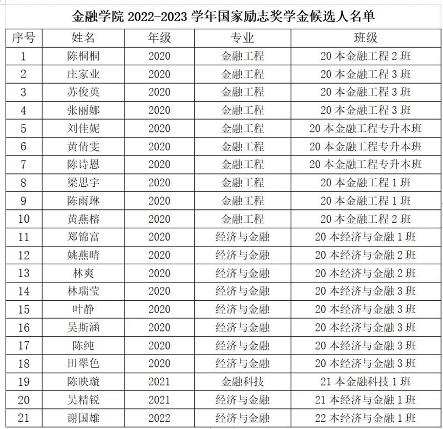 根据2023年广州华商学院国家励志奖助学金工作的相关文件精神,我院秉承公平、公正、公开的原则,严格按照国家励志奖学金评审程序,经个人自荐、资格审查以及学院评审委员会讨论与评审,拟推荐以下21名同学为2022-2023学年国家励志奖学金候选人,具体名单如下:
