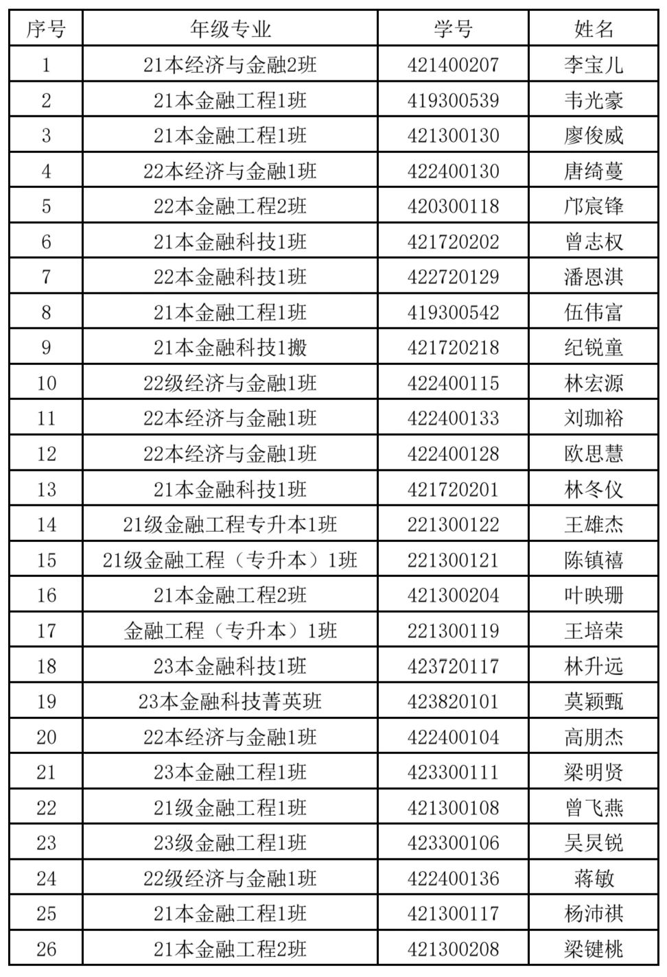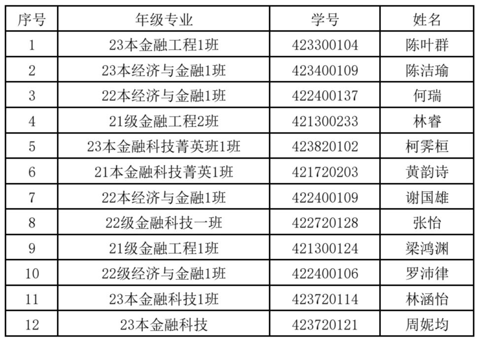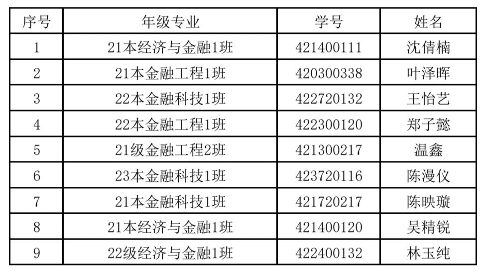根据广州华商学院《关于2023-2024学年学生综合测评和优秀生评选工作的通知》文件内容,我院本着“公开、公正、公平、择优”的原则,认真组织2023-2024学年优秀学生干部评选工作。经学生自主申请,班级和组织评议、学院评审委员会评定,我院决定拟推荐沈倩楠等47名学生为校优秀生。 数字金融学院2023-2024学年综合测评校级优秀生名单公示如下: 一等奖 二等奖 三等奖 对评选结果有异议者,可于公示期间内通过电话或电子邮件等形式反映,反映情况和问题必须实事求是,对评选有异议的同学由我院进行调查后审定,并对提出异议的个人给予保密。 公示时间:2024年10月14日—2024年10月18日 受理邮箱:1498111064@qq.com(张老师) 广州华商学院数字金融学院 2024年10月14日