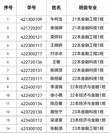 根据广州华商学院《关于2023-2024学年学生综合测评和优秀学生干部评选工作的通知》文件精神,我院本着“公开、公正、公平、择优”的原则,认真组织2023-2024学年优秀学生干部评选工作。经学生自主申请,班级和组织评议、学院评审委员会评定,我院决定拟推荐牛柯浩等14名学生为校级优秀学生干部。 数字金融学院2023-2024学年综合测评校级优秀学生干部名单公示如下: 对评选结果有异议者,可于公示期间内通过电话或电子邮件等形式反映,反映情况和问题必须实事求是,对评选有异议的同学由我院进行调查后审定,并对提出异议的个人给予保密。 公示时间: 2024年10月14日—2024年10月18日 受理邮箱:1498111064@qq.com 广州华商学院数字金融学院 2024年10月14日