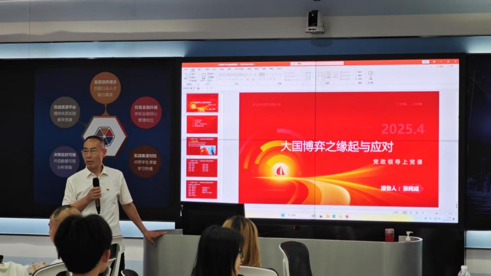 为深入贯彻新发展理念,持续推进国家创新体系建设,强化战略科技力量,加速创新型国家建设进程,同时厚植广大青年爱党爱国爱社会主义的深厚情怀,坚定青少年跟党走中国特色社会主义道路的信念,数字金融学院立足专业特色与学科优势,于 2025 年 4 月 22 日在厚德楼C301教室成功举办主题为“大国博弈之缘起与应对”的数字金融学院思政第一课。本次课程由数字金融学院院长张纯威教授担任主讲,为师生们带来了一场思想与知识交融的盛宴。 张教授指出,中国以和平发展姿态迈向世界舞台中心,经济规模、科技实力等领域的跃升引发全球格局深刻调整。中美博弈本质是守成大国与新兴大国在国际秩序重构中的深层较量。 张教授以汇率波动、资本流动等案例,揭示金融领域作为大国博弈“前沿阵地”的关键作用。从美国通过美元霸权收割全球财富的历史逻辑,到当前对中国金融市场的渗透与遏制,深入浅出解析金融安全对国家发展的根本性意义。 面对复杂局势,中国始终坚持“不惹事、不怕事”原则。张教授从货币政策独立性、外汇储备管理、人民币国际化等维度,阐述我国如何通过完善金融监管体系、深化国际合作应对外部冲击,展现“稳字当头、以我为主”的应对智慧。 “金融强国建设是实现民族复兴的重要支撑。”张教授强调,需从三方面发力: 科技赋能:推动数字金融、区块链等技术与实体经济深度融合,提升金融服务效率; 制度创新:健全资本市场基础制度,扩大高水平制度型开放; 人才培育:培养兼具国际视野与家国情怀的金融人才,筑牢创新发展根基。 授课尾声,张教授寄语华商青年学子:“大国博弈的终局,取决于当代青年的眼界与行动。”他鼓励同学们将专业学习与国家战略结合,以扎实学识破解“卡脖子”难题,以开放心态讲好中国金融故事,在服务“双循环”新发展格局中彰显青春力量。 本次思政课以宏大视野串联理论与现实,既是一堂深刻的国情教育课,更是一次点燃青年奋斗热情的思想动员。未来,数字金融学院将持续深化“思政+专业”育人模式,引导学子在时代变局中找准坐标,以创新之力续写大国崛起新篇章!
