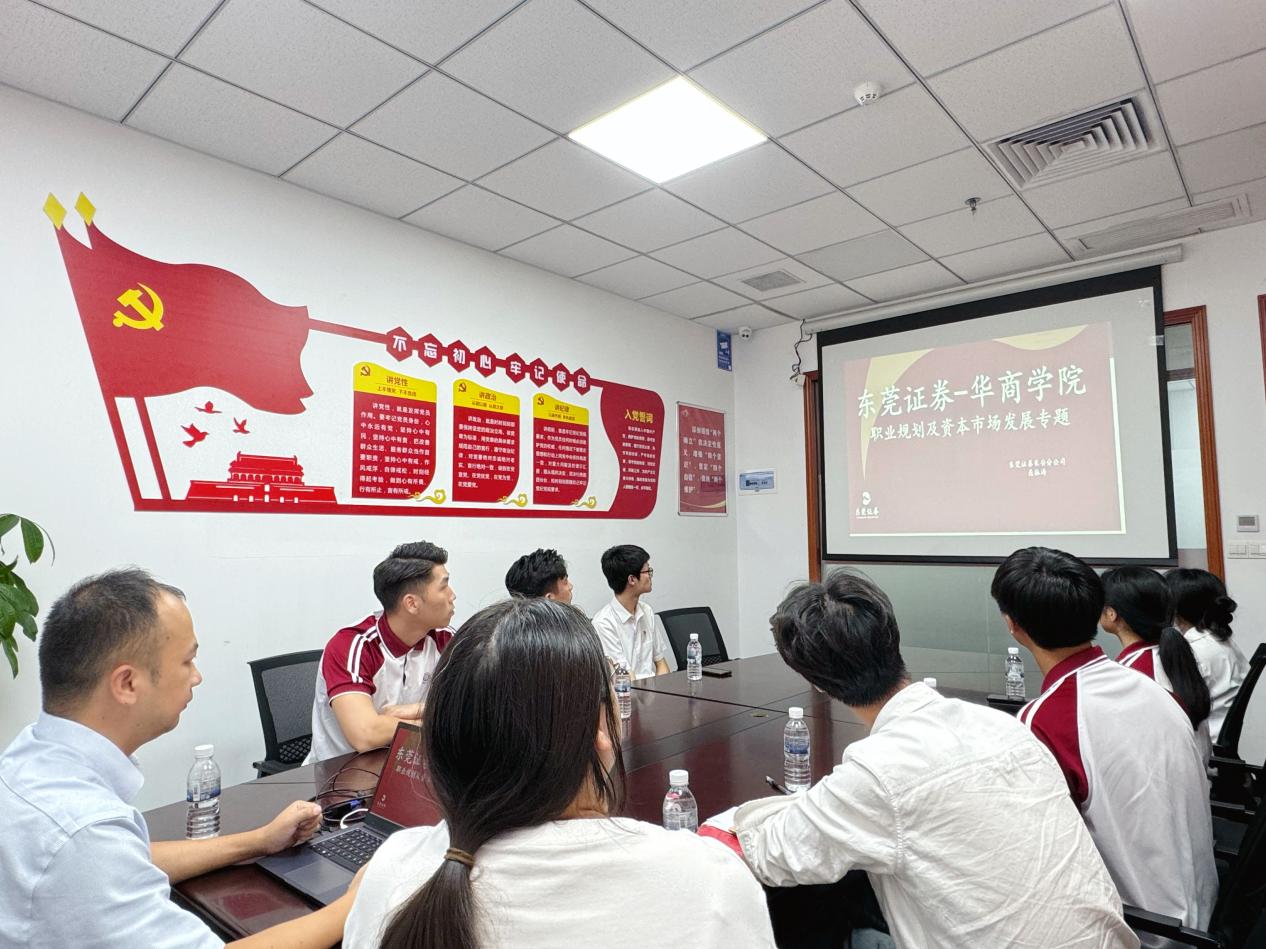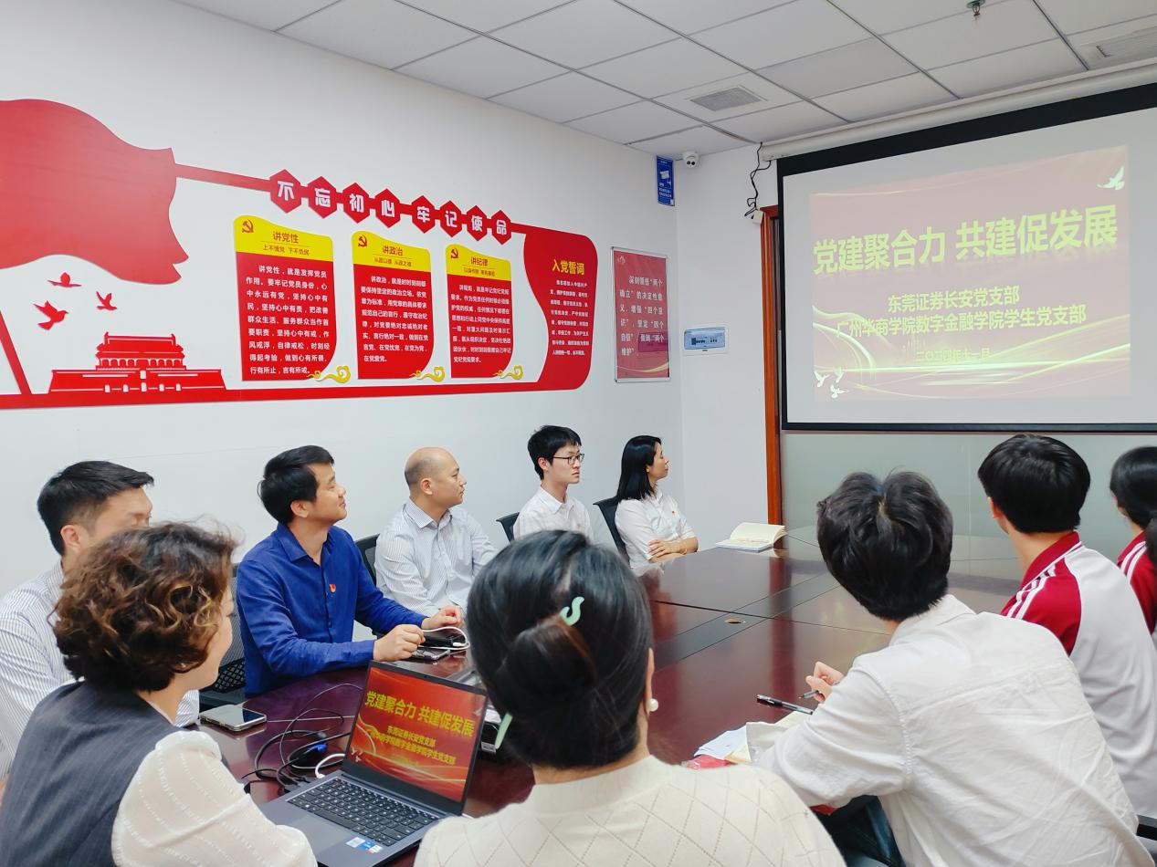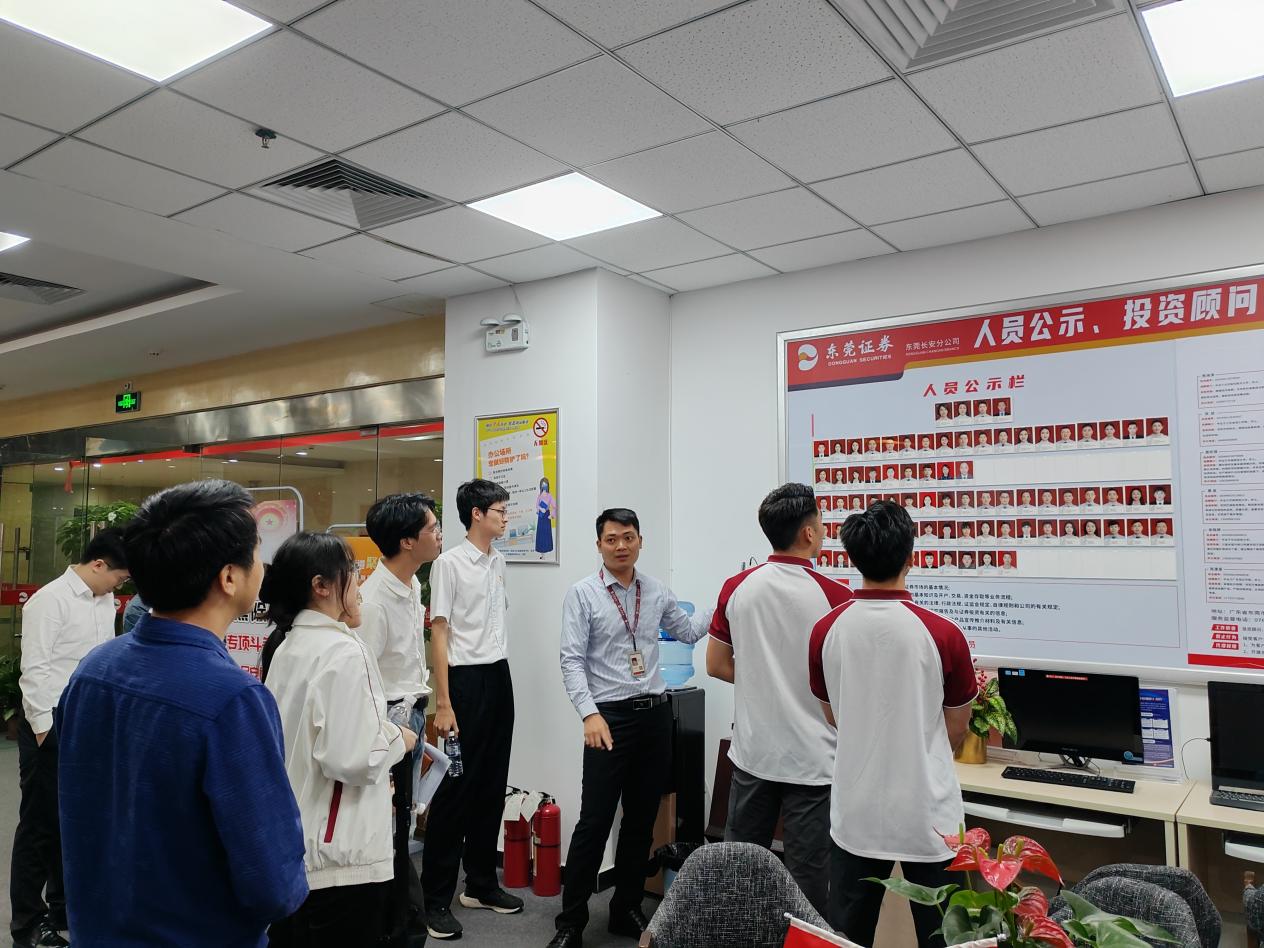 广州华商学院数字金融学院深化校企合作,推动产教融合和校企党建共融,2024年11月5日下午,由党委副书记兼副院长邱会锋、党务工作组织员张文杰老师及学生党员代表组成的团队,前往东莞证券股份有限公司长安分公司进行参观交流,并开展党建共建活动。此行旨在通过实地考察,增进学生对证券行业的认识,提升职业素养与实践能力;开展党建共建活动,借鉴企业在党建工作中的创新做法和成功经验。 东莞证券长安分公司对此次访问高度重视,总经理杨小惠、副总经理邓汉新、陈小燕、曾启华,以及区域总监施祖林、机构业务岗聂振涛等热情接待。座谈会上,杨小惠总经理首先对邱会锋副院长一行表示欢迎,并简要介绍了公司的发展历程、业务领域和市场情况。双方就证券行业热点、职业规划等话题进行了深入交流。杨总建议学生们在校期间注重综合素质提升,积极学习,掌握营销技巧,增强沟通与团队协作能力。 聂振涛针对证券行业的职业前景进行了详细讲解,分析了行业现状与发展趋势,并结合实际案例,阐述了岗位设置、晋升途径、薪酬福利及员工成长路径。他强调证券行业对人才的重视,鼓励学生们投身其中,实现个人与社会的双重价值。 随后,在党员会议室,双方开展了党建共建交流活动。杨小惠书记以“党建聚合力、共建促发展”为题,进行了党课讲解,传达了党的二十届三中全会精神。双方分享了党建工作经验与成果,并就如何加强党建引领、推动业务发展等话题进行了深入探讨。 最后,施祖林区域总监引领邱会锋副院长一行参观了公司,实地了解了办公环境、业务流程、客户服务体系及党员活动场所。通过实地考察,师生们对证券公司的运营模式及业务流程有了更为直观和深刻的理解。 此次走访东莞证券长安分公司参观交流暨党建共建活动,学生们不仅了解了证券公司的运营模式和业务流程,还深刻认识到了证券行业的重要性和发展前景。同时,师生们也与东莞证券长安分公司的员工建立了深厚的友谊和联系,为今后的校企合作奠定了坚实基础。数字金融学院将继续加强与企业的合作与交流,为学生提供更多实习就业机会和职业发展平台。